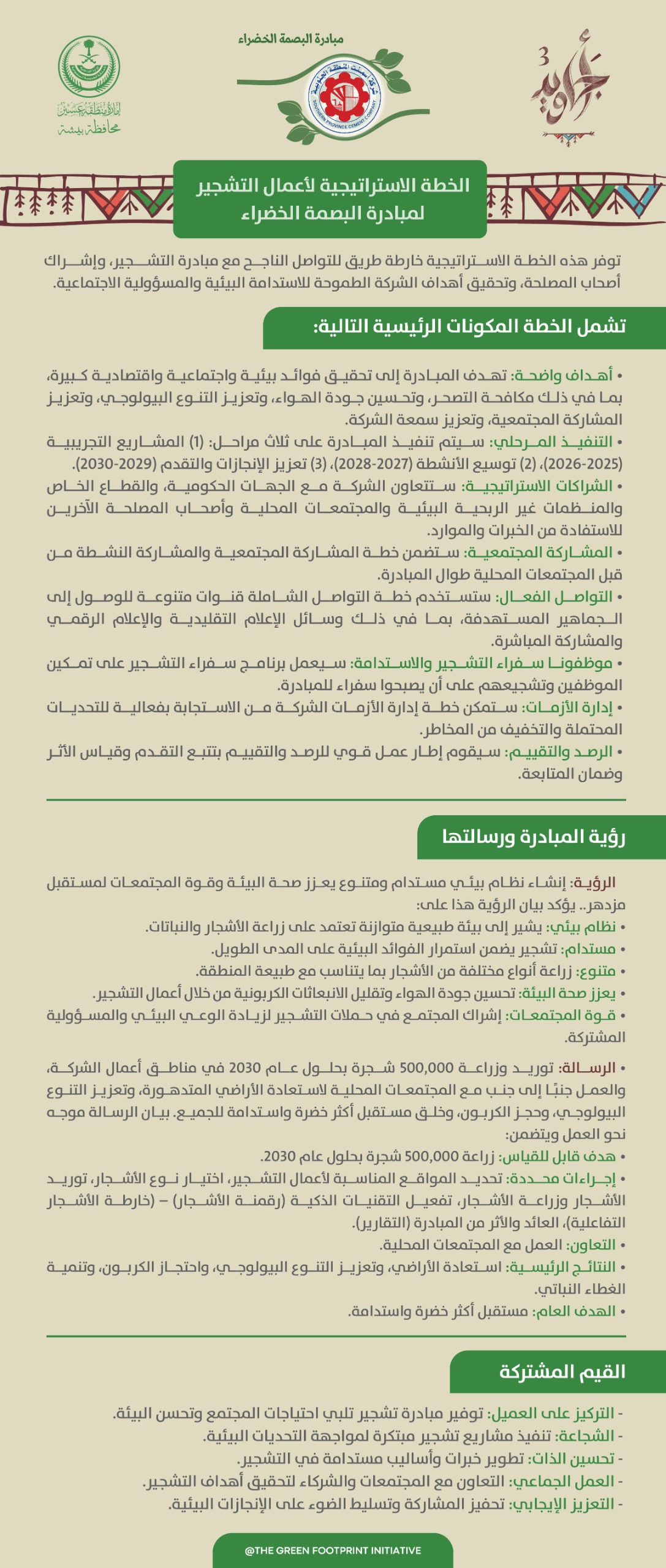 تعد مبادرة البصمة الخضراء التي أطلقتها شركة أسمنت المنطقة الجنوبية لزراعة 500 ألف شجرة في الخمسة الأعوام 2025 – 2030 خطوة جريئة وهامة نحو تحقيق الاستدامة البيئية. هذه المبادرة ليست مجرد رقم، بل هي تعبير عن التزام الشركة بمسؤوليتها الاجتماعية والبيئية، ومساهمتها الفاعلة في الحفاظ على البيئة وتحسين جودة الحياة.